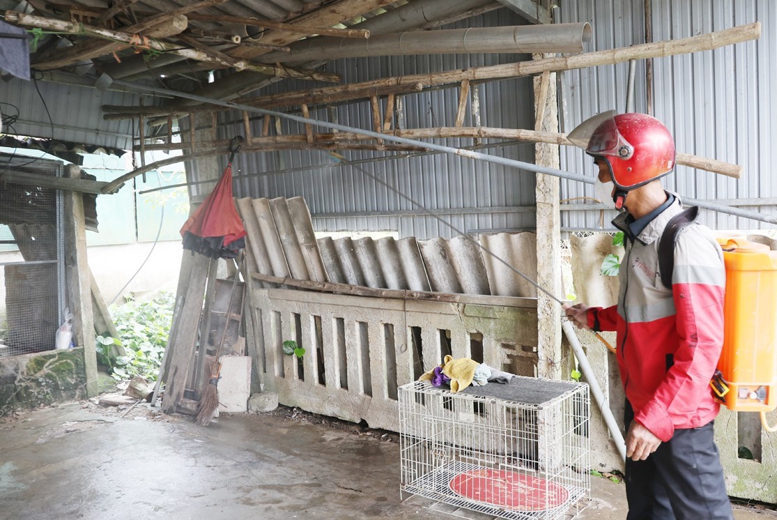 Phun hóa chất tiêu độc khử trùng chuồng trại và nhà ở của các hộ dân có gia cầm bị chết.